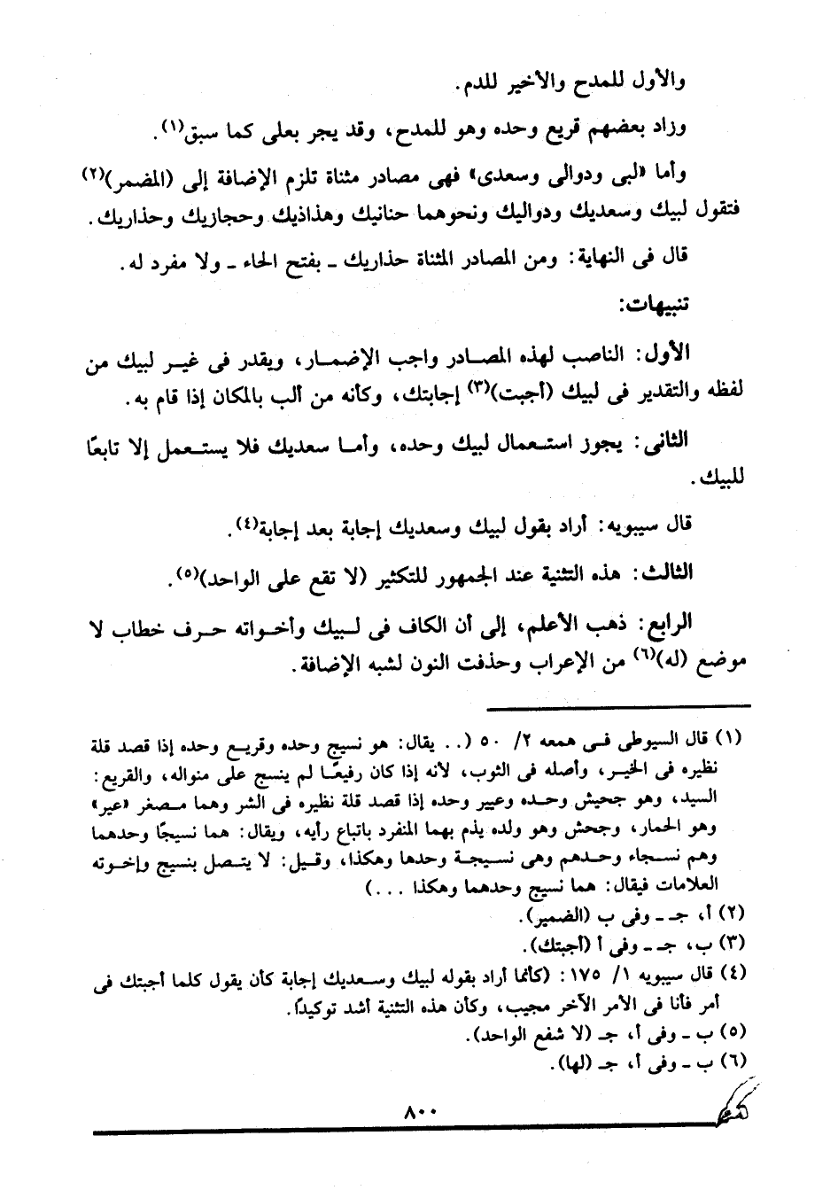 4 قال سيبويه "1/ 175: "كأنما أراد بقوله: لبيك وسعديك إجابة, كأن يقول: كلما أجبتك في أمر فأنا في الأمر الآخر مجيب، وكأن هذه التثنية أشد توكيدا".