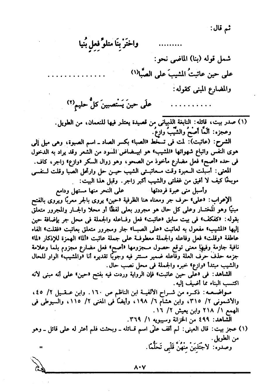الشاهد: في "على حين عاتبت", فإن الرواية وردت فيه بفتح "حين" على أنه مبني؛ لأنه اكتسب البناء مما أضيف إليه.