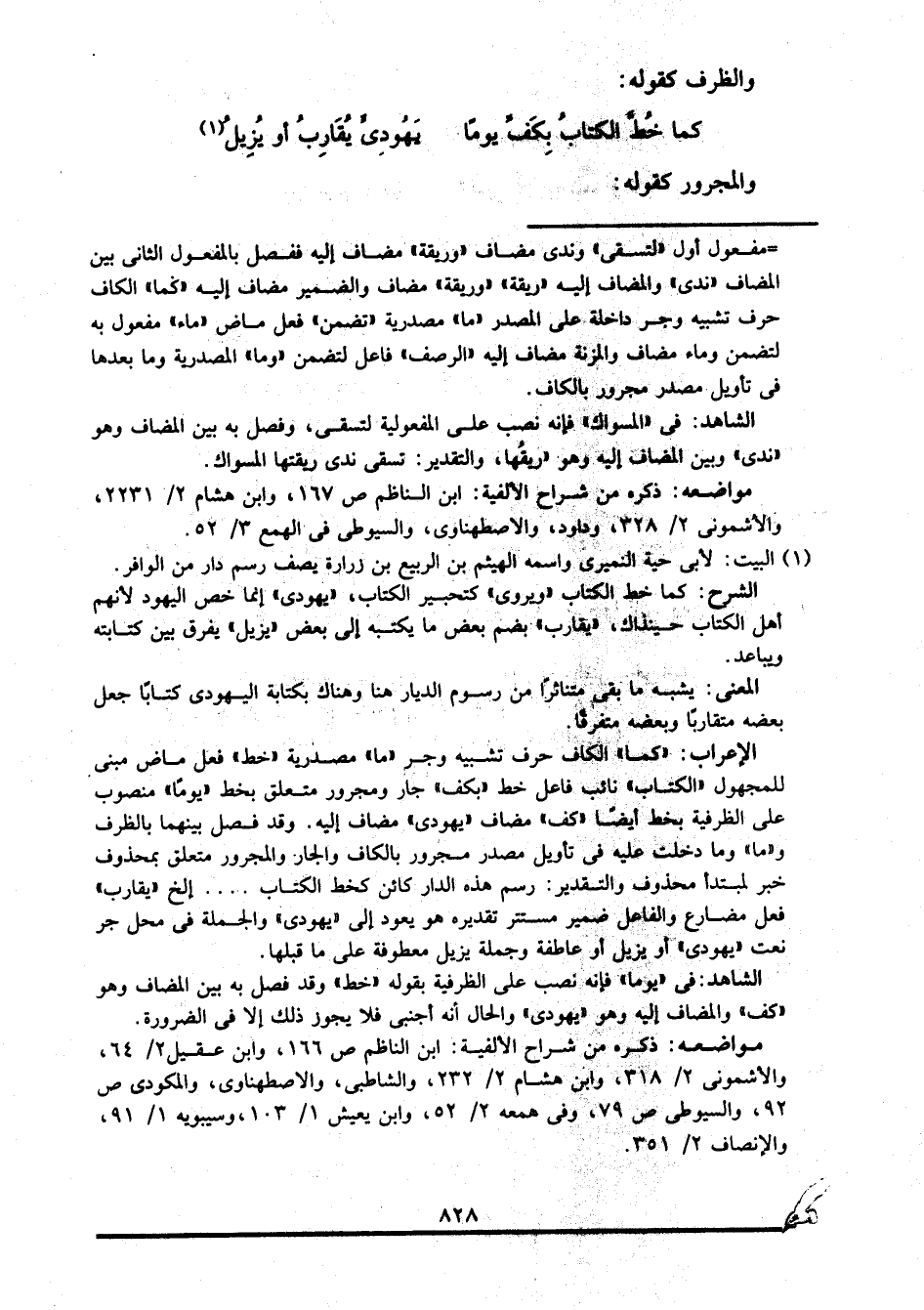 الإعراب: "كما" الكاف حرف تشبيه وجر "ما" مصدرية, "خط" فعل ماض مبني للمجهول, "الكتاب" نائب فاعل خط, "بكف" جار ومجرور متعلق بخط, "يوما" منصوب على الظرفية بخط أيضا, "كف" مضاف "يهودي" مضاف إليه, وقد فصل بينهما بالظرف و"ما" وما دخلت عليه في تأويل مصدر مجرور بالكاف, والجار والمجرور متعلق بمحذوف خبر لمبتدأ محذوف والتقدير: رسم هذه الدار كائن كخط الكتاب.... إلخ, "يقارب" فعل مضارع والفاعل ضمير مستتر تقديره هو يعود إلى "يهودي", والجملة في محل جر نعت "يهودي", "أو يزيل" أو عاطفة, وجملة يزيل معطوفة على ما قبلها.