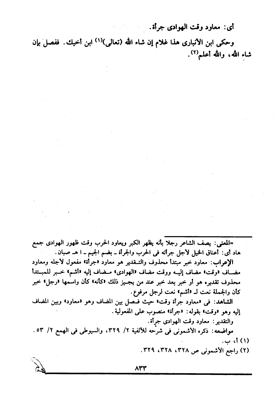 = المعنى: يصف الشاعر رجلا بأنه يظهر الكبر ويعاود الحرب وقت ظهور الهوادي جمع هادٍ أي: أعناق الخيل لأجل جرأته في الحرب, والجرأة بضم الجيم ا. هـ. صبان.