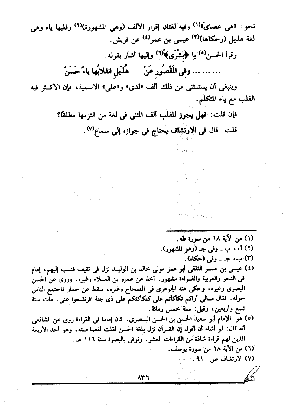 نحو: "هي عصايَ"1 وفيه لغتان: إقرار الألف "وهي المشهورة"2, وقلبها ياء وهي لغة هذيل "وحكاها"3 عيسى بن عمر4 عن قريش.
