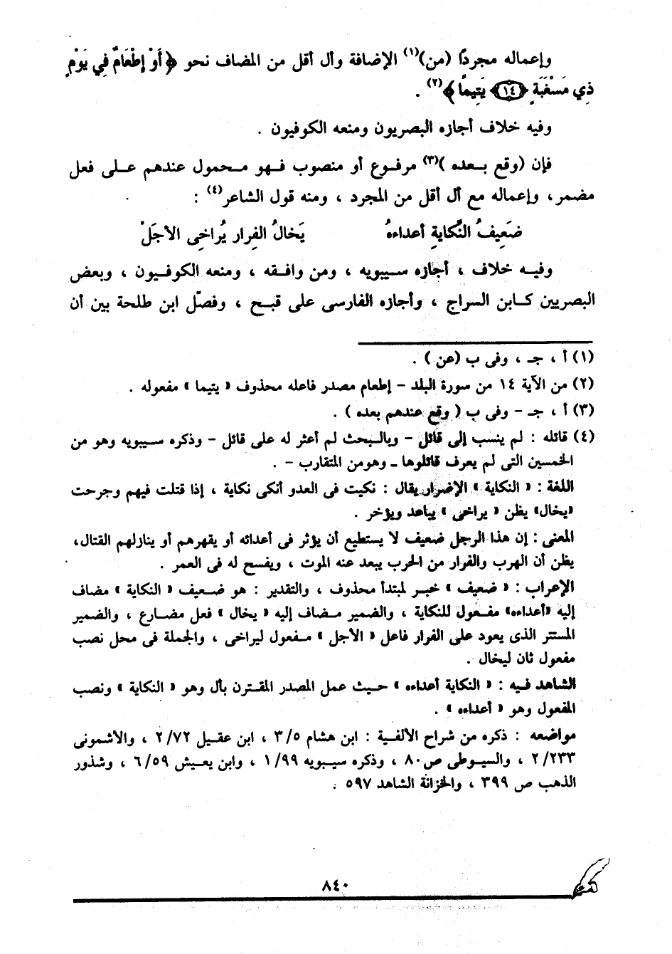 الشاهد فيه: "النكاية أعداءه", حيث عمل المصدر المقترن بأل وهو "النكاية", ونصب المفعول وهو "أعداءه".