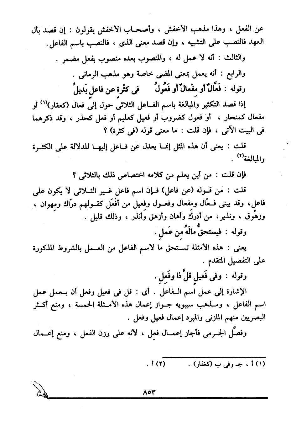 الإشارة إلى عمل اسم الفاعل, أي: قل في فعيل وفعل أن يعمل عمل اسم الفاعل، ومذهب سيبويه جواز إعمال هذه الأمثلة الخمسة، ومنع أكثر البصريين منهم المازني والمبرد إعمال فعيل وفعل.