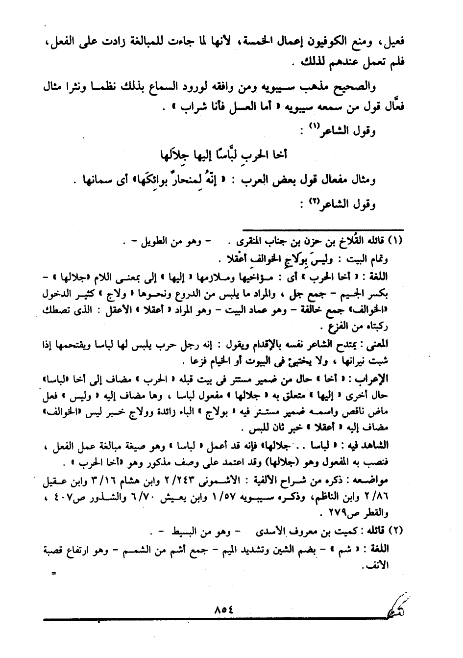 الشاهد فيه: "لباسا.... جلالها", فإنه قد أعمل "لباسا" وهو صيغة مبالغة عمل الفعل، فنصب به المفعول وهو "جلالها", وقد اعتمد على وصف مذكور وهو "أخا الحرب".