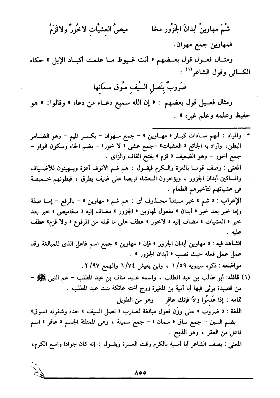الإعراب: "شم" خبر مبتدأ محذوف أي: هم شم, "مهاوين" -بالرفع- إما صفة وإما خبر بعد خبر, "أبدان" مفعول لمهاوين, "الجزور" مضاف إليه, "مخاميص" خبر بعد خبر, "العشيات" مضاف إليه, "لا خور" عطف على ما قبله من المرفوع, "ولا قزم" عطف عليه.