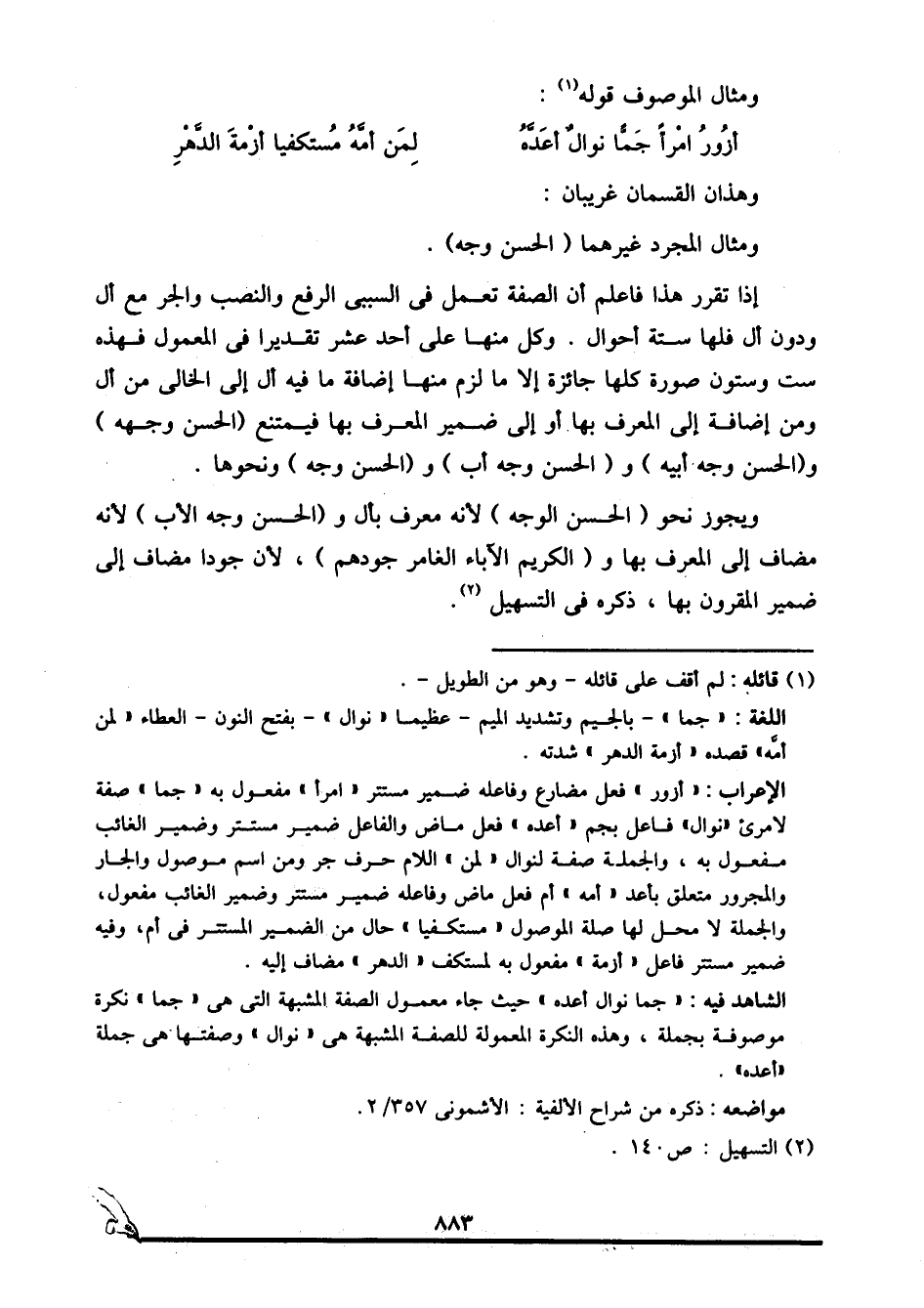 الشاهد فيه: "جما نوال أعده" حيث جاء معمول الصفة المشبهة التي هي "جما" نكرة موصوفة بجملة، وهذه النكرة المعمولة للصفة المشبهة هي "نوال" وصفتها هي جملة "أعده".