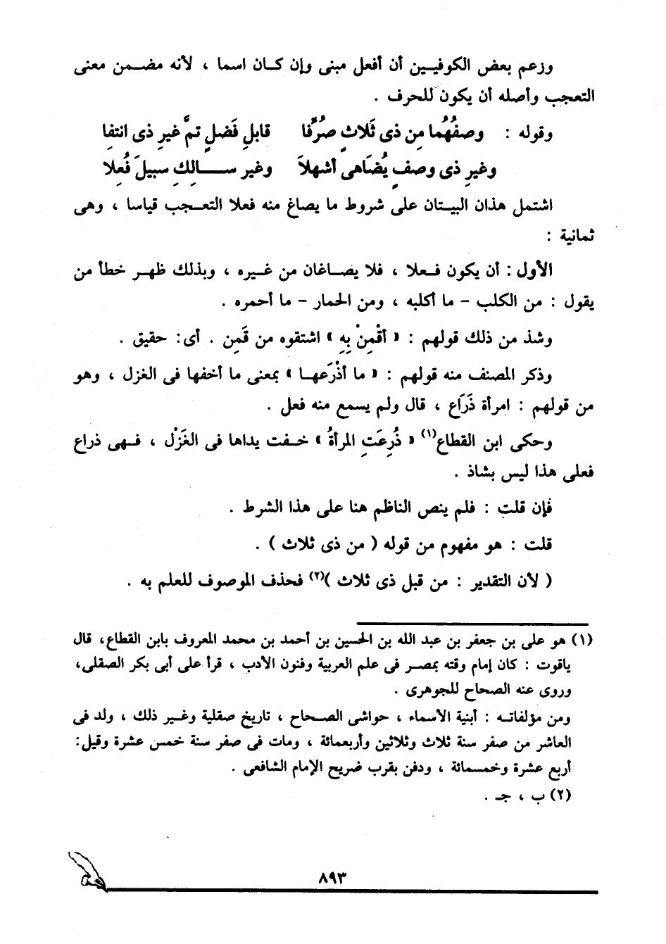 اشتمل هذان البيتان على شروط ما يصاغ منه فعلا التعجب قياسا، وهي ثمانية: