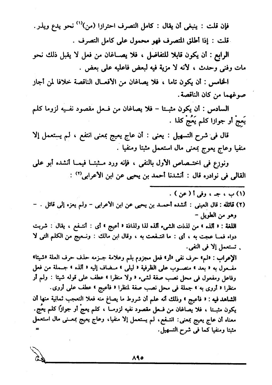 الشاهد فيه: "فأعيج" وذلك أنه علم أن شروط ما يصاغ منه فعلا التعجب ثمانية, منها أن يكون مثبتا، فلا يصاغان من فعل مقصود نفيه لزوما، كلم يعج, أو جوازا كلم يعج. معناه: أن عاج يعيج بمعنى: انتفع، لم يستعمل إلا منفيا، وعاج يعيج بمعنى مال استعمل مثبتا ومنفيا كما في شرح التسهيل.