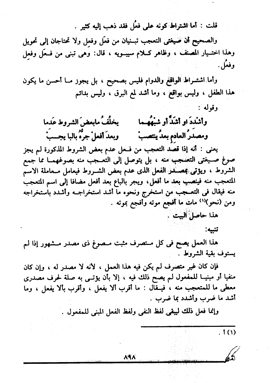 فإن كان غير متصرف لم يكن فيه هذا العمل؛ لأنه لا مصدر له، وإن كان منفيا أو مبنيا للمفعول لم يصح ذلك فيه، إلا بأن يؤتى به صلة لحرف مصدري معطى ما للمتعجب منه، فيقال: ما أقرب ألا يفعل وأقرب بألا يفعل، وما أشد ما ضرب وأشدد بما ضرب.