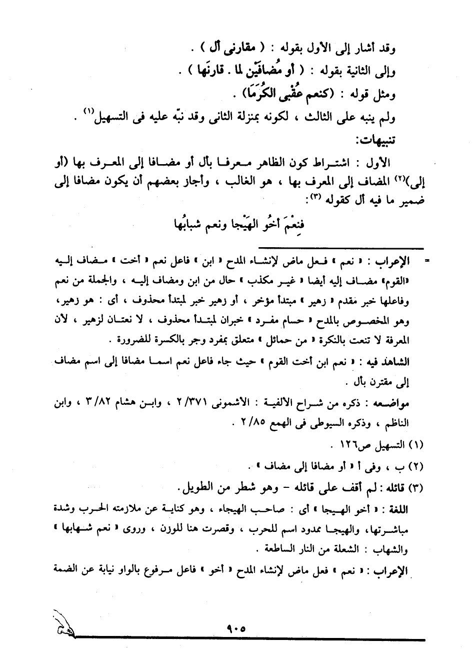 الأول: اشتراط كون الظاهر معرفا بأل أو مضافا إلى المعرفة بها "أو إلى"2 المضاف إلى المعرف بها، هو الغالب، وأجاز بعضهم أن يكون مضافا إلى ضمير ما فيه أل كقوله3: