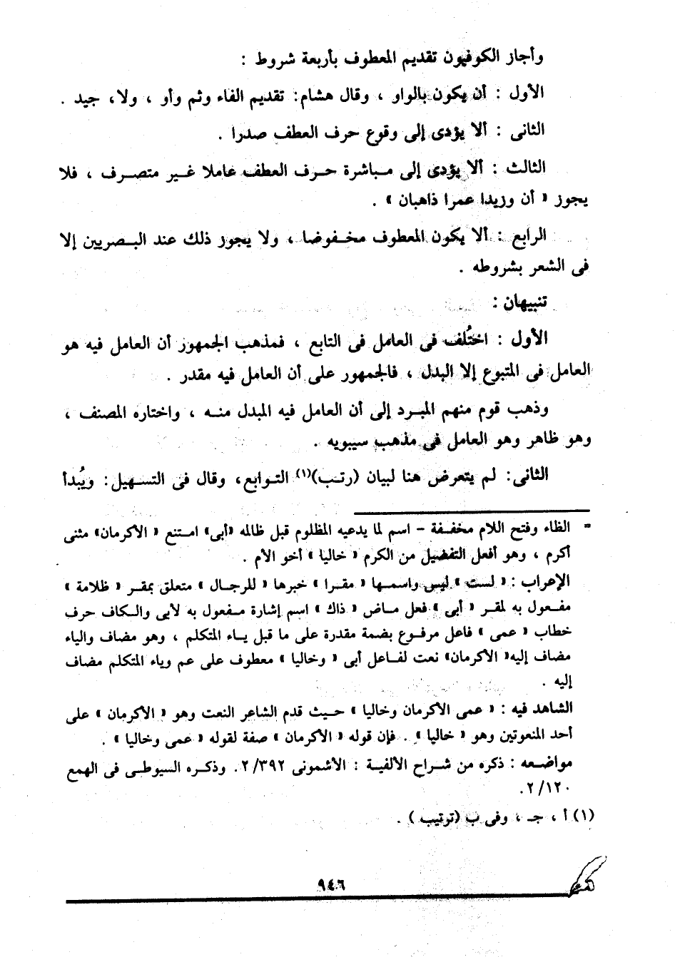 وأجاز الكوفيون تقديم المعطوف بأربعة شروط: