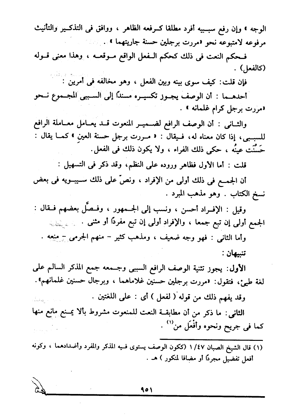 1 قال الشيخ الصبان 47/ 1: "ككون الوصف يستوي فيه المذكر والمفرد وأضدادهما، وكونه أفعل تفضيل مجردا أو مضافا لمنكور" هـ.