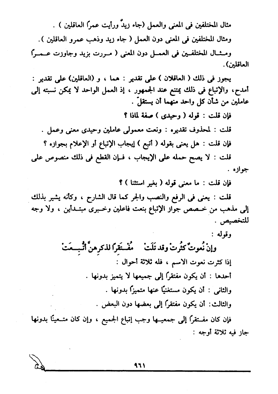 ومثال المختلفين في المعنى دون العمل: "جاء زيد وذهب عمرو العاقلين".