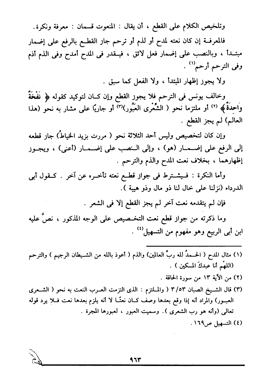 وما ذكرته من جواز قطع نعت التخصيص على الوجه المذكور, نص عليه ابن أبي الربيع وهو مفهوم من التسهيل4.