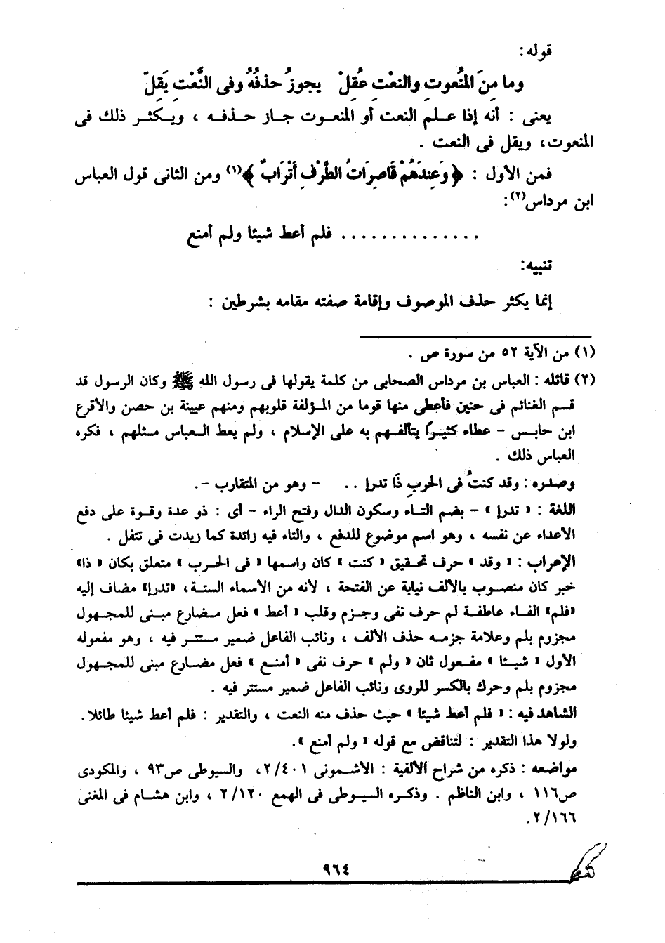 الشاهد فيه: "فلم أعط شيئا" حيث حذف منه النعت، والتقدير: فلم أعط شيئا طائلا.