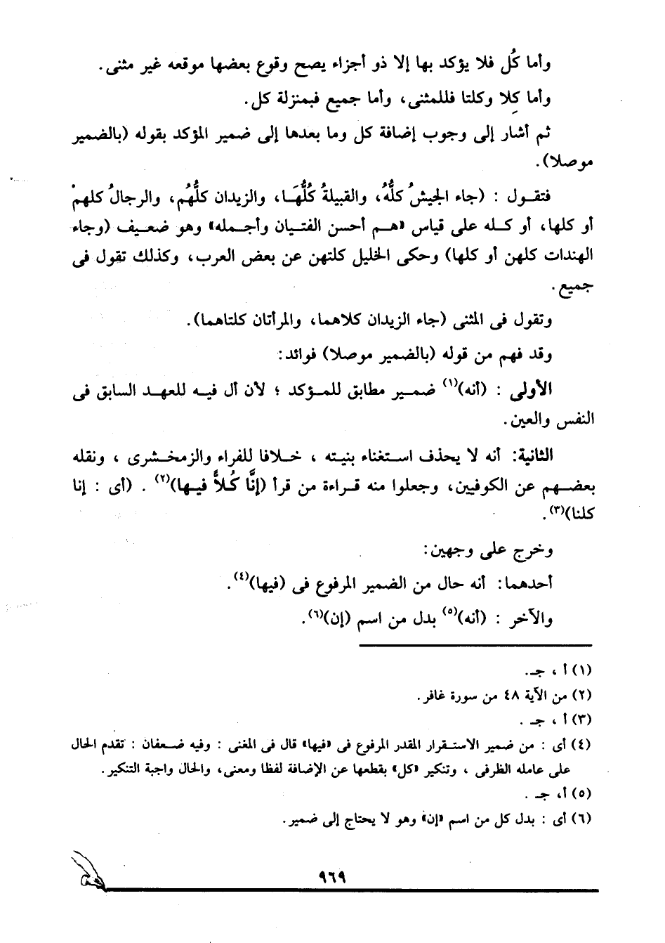 فتقول: جاء الجيشُ كلُّه، والقبيلةُ كلُّها، والزيدان كلهم، والرجال كلهم أو كلها، أو كله على قياس "هم أحسن الفتيان وأجمله" وهو ضعيف, "وجاء الهندات كلهن أو كلها" وحكى الخليل كلتهن عن بعض العرب، وكذلك تقول في جميع.