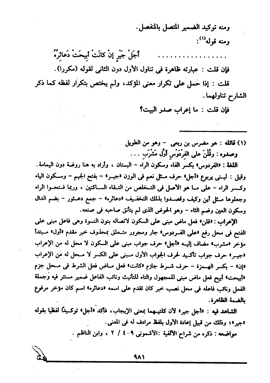 الشاهد فيه: "أجل جير" لأن كلتيهما بمعنى الإيجاب، فأكد "أجل" توكيدا لفظيا بقوله: "جير", وذلك من قبيل إعادة الأول بلفظ مرادف له في المعنى.