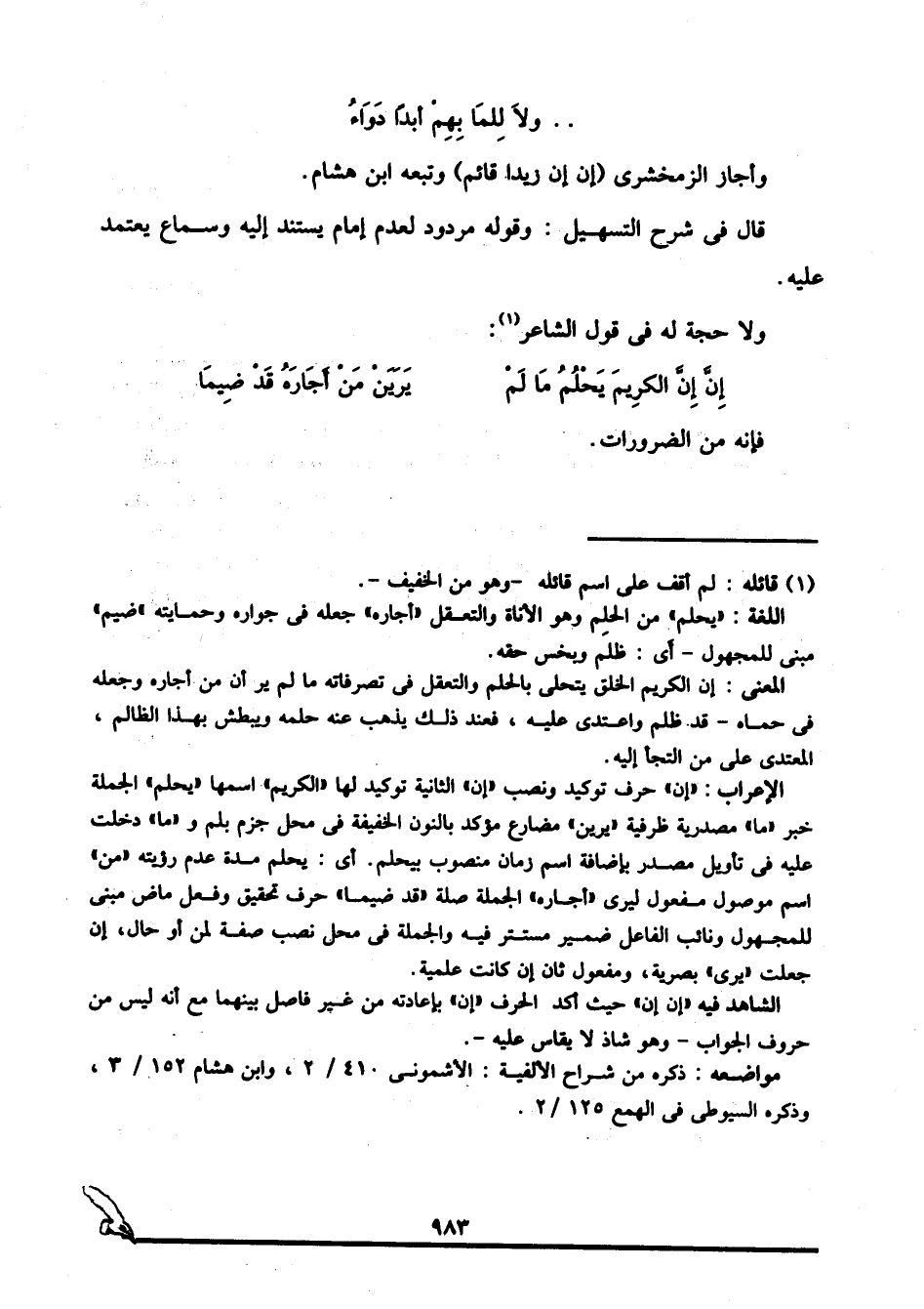 الإعراب: "إن" حرف توكيد ونصب, "إن" الثانية توكيد لها, "الكريم" اسمها, "يحلم" الجملة خبر, "ما" مصدرية ظرفية, "يرين" مضارع مؤكد بالنون الخفيفة في محل جزم بلم, و"ما" دخلت عليه في تأويل مصدر بإضافة اسم زمان منصوب بيحلم, أي: يحلم مدة عدم رؤيته, "من" اسم موصول مفعول ليرى, "أجاره" الجملة صلة, "قد ضيما" حرف تحقيق, وفعل ماض مبني للمجهول ونائب الفاعل ضمير مستتر فيه, والجملة في محل نصب صفة لمن أو حال إن جعلت "يرى" بصرية، ومفعول ثانٍ إن كانت علمية.