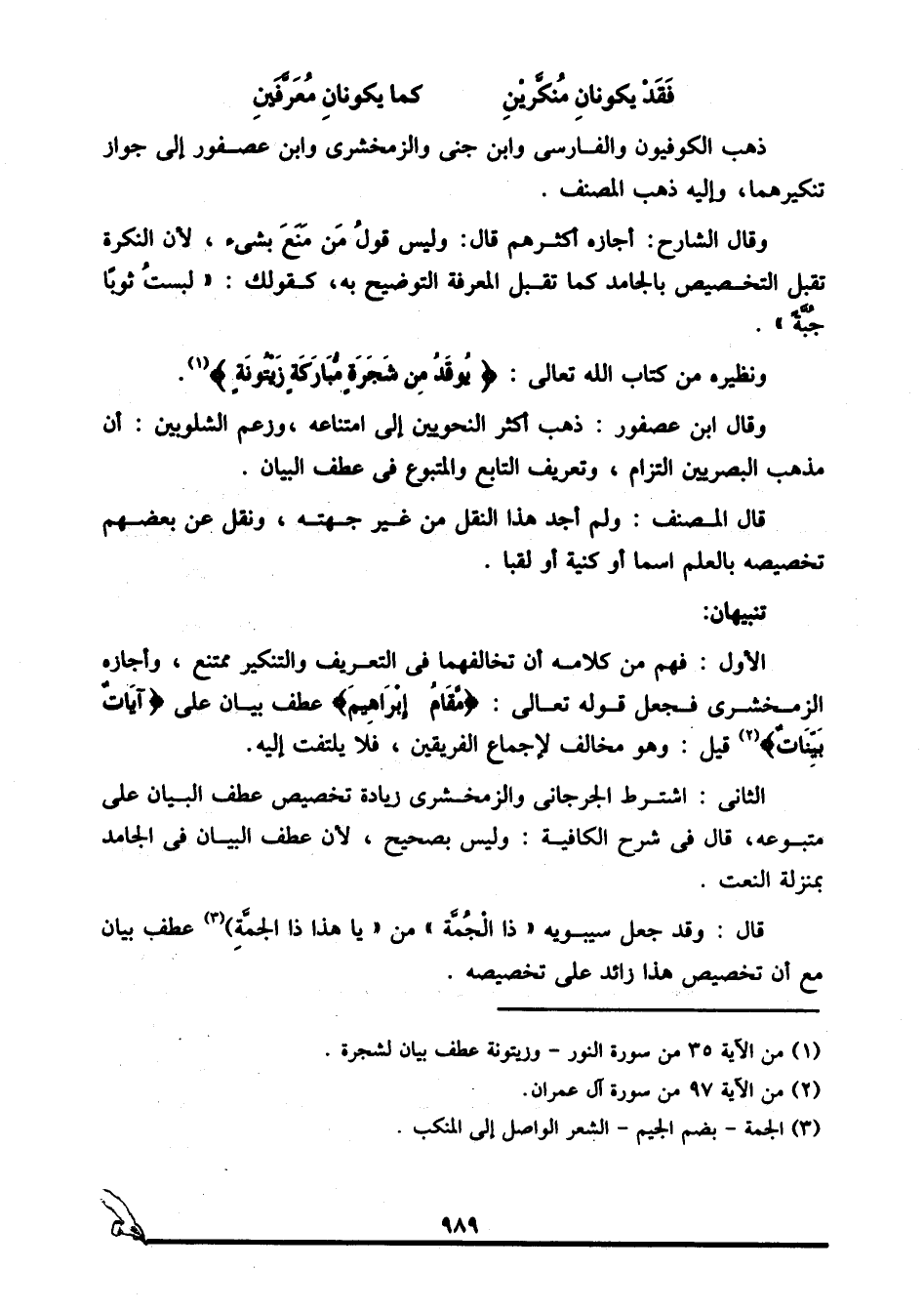 الأول: فهم من كلامه أن تخالفهما في التعريف والتنكير ممتنع، وأجازه الزمخشري فجعل قوله تعالى: {مَقَامِ إِبْرَاهِيمَ} عطف بيان على {آيَاتٌ بَيِّنَاتٌ} 2 قيل: وهو مخالف لإجماع الفريقين، فلا يلتفت إليه.