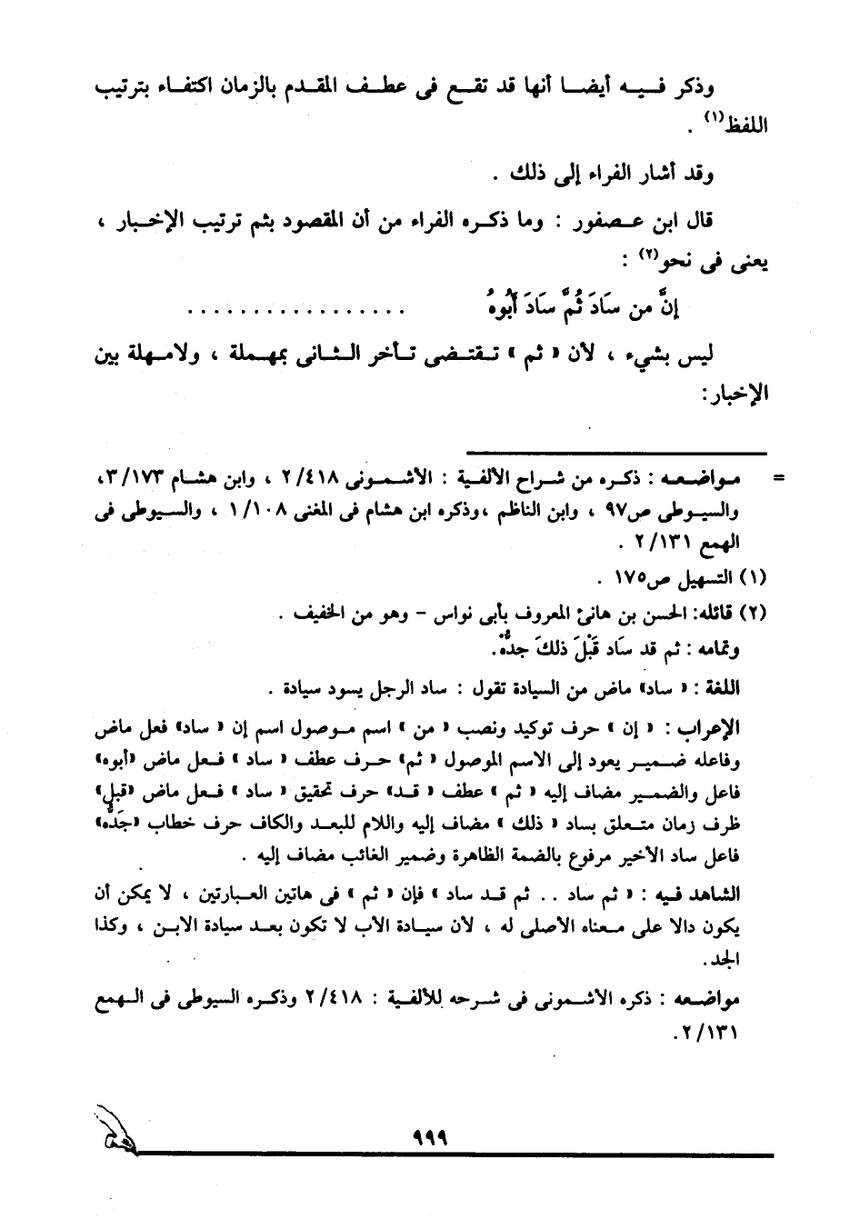 الشاهد فيه: "ثم ساد ... ثم قد ساد" فإن "ثم" في هاتين العبارتين, لا يمكن أن يكون دالا على معناه الأصلي له؛ لأن سيادة الأب لا تكون بعد سيادة الابن، وكذا الجد.