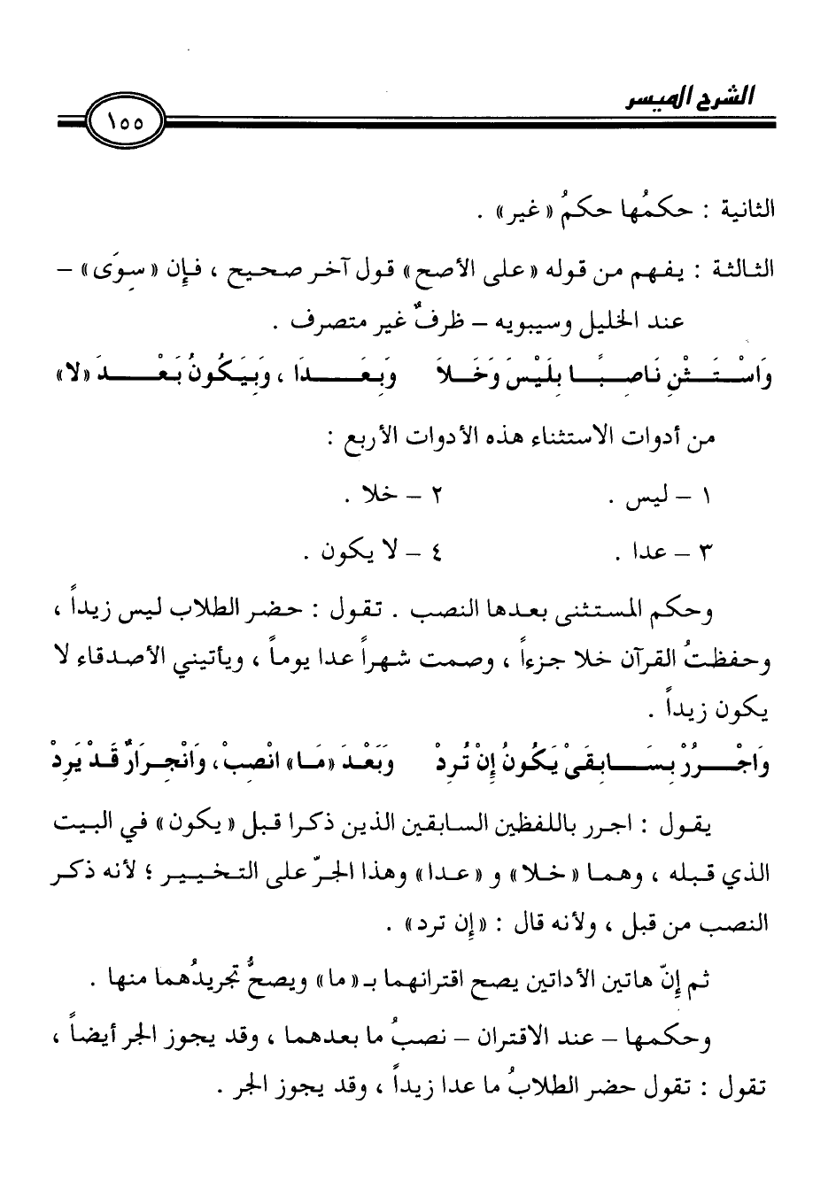 وَاسْتَثْنِ نَاصِبًا بِلَيْسَ وَخَلاَ وَبِعَدَا، وَبِيَكُونُ بَعْدَ " لا"
