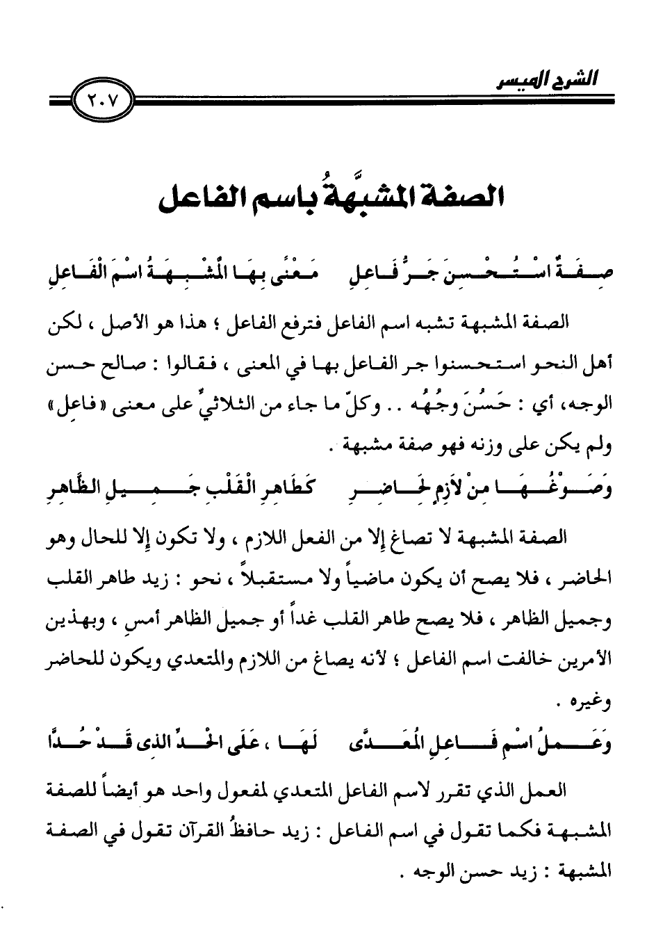 صِفَة اسْتُحْسِنَ جَرُّ فَاعِلِ مَعْنًى بِهَا المْشْبِهَةُ اسمَ الْفَاعِلِ