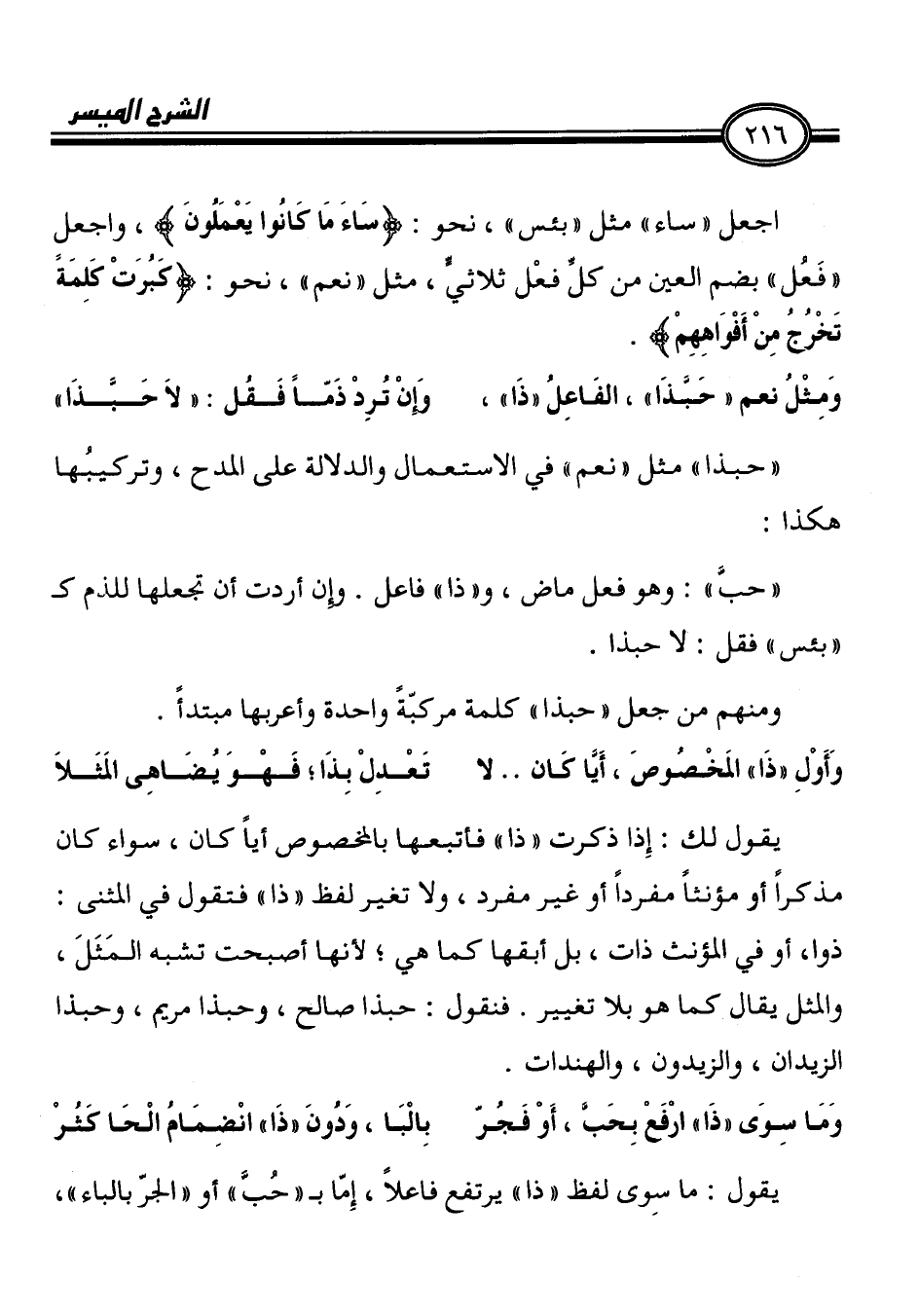 وَمِثْلُ نعم " حَبَّذَا"، الفَاعِلُ " ذَا"، وِإنْ تُرِةْ ذَمّاً فَقُل: " لاَ حَبَّذَا"