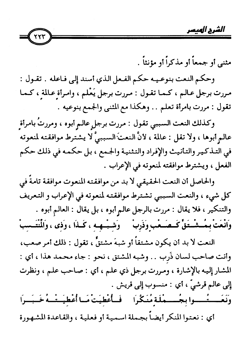 كل شيء، والنعت السببي تشترط موافقته لمنعوته في الإِعراب و التعريف