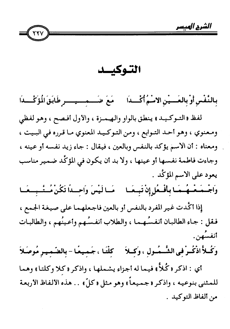 ا ومعناه: أن الاسنم يوكد بالنفس وبالعين، فيفال: جاء زيد نفسه أو عينه،