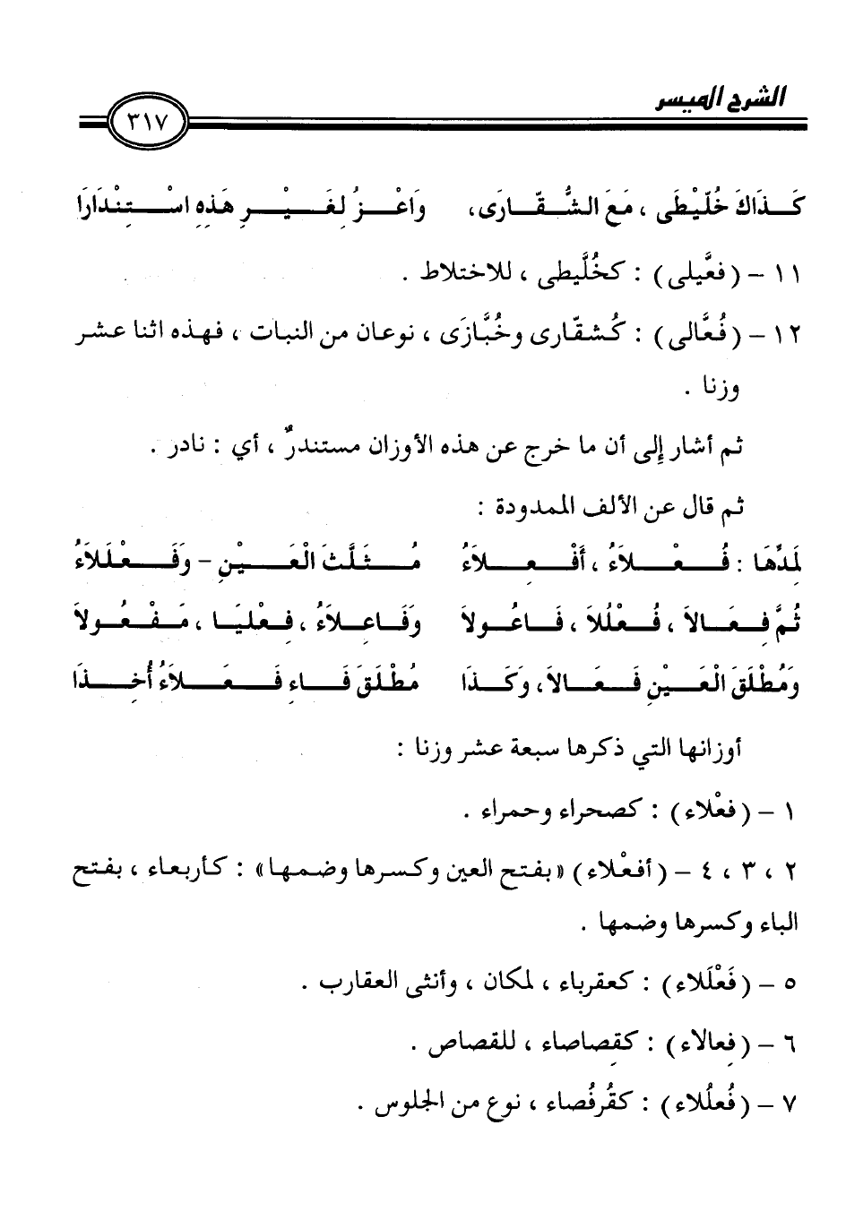 ثُمَّ فِعَالاَ، فُعْلُلاَ، فَاعُولاَ وَفَاعِلاَءُ، فِعْليَا، مَفْعُولاَ