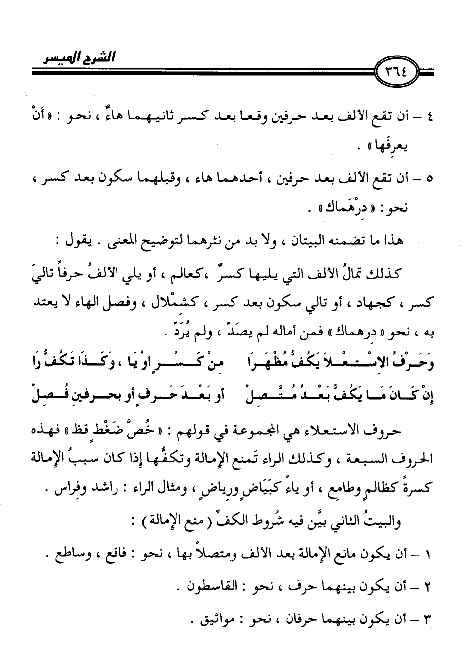 والبيتُ الثاني بيَّن فيه شُروط الكفِّ (منع الإِمالة):