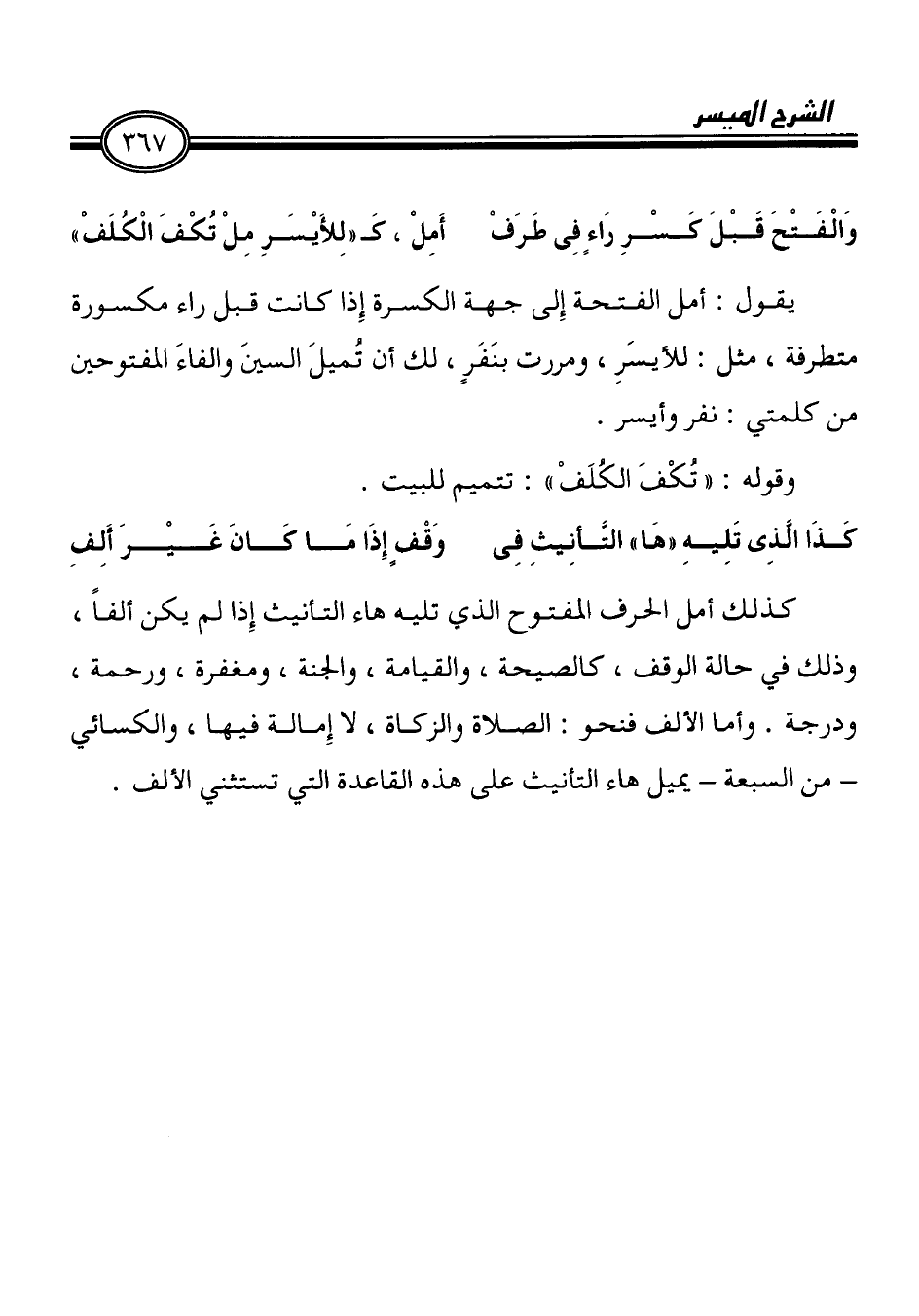 وَالْفَتْحَ قَبْلَ كَسْرِ رَاءٍ فِى طَرَفْ أَمِلْ،! (الِلأَيْسَرِ مِلْ تُكْفَ الْكُلَّفْ"