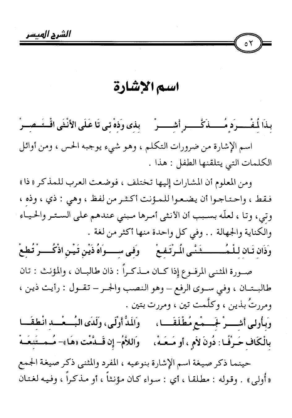 بِذَا لمُفْرَدٍ مُذَكَّرٍ أَشِرْ بِذِى وَذِهْ تِى تَا عَلَى الأنْثَى اقْتَصِرْ