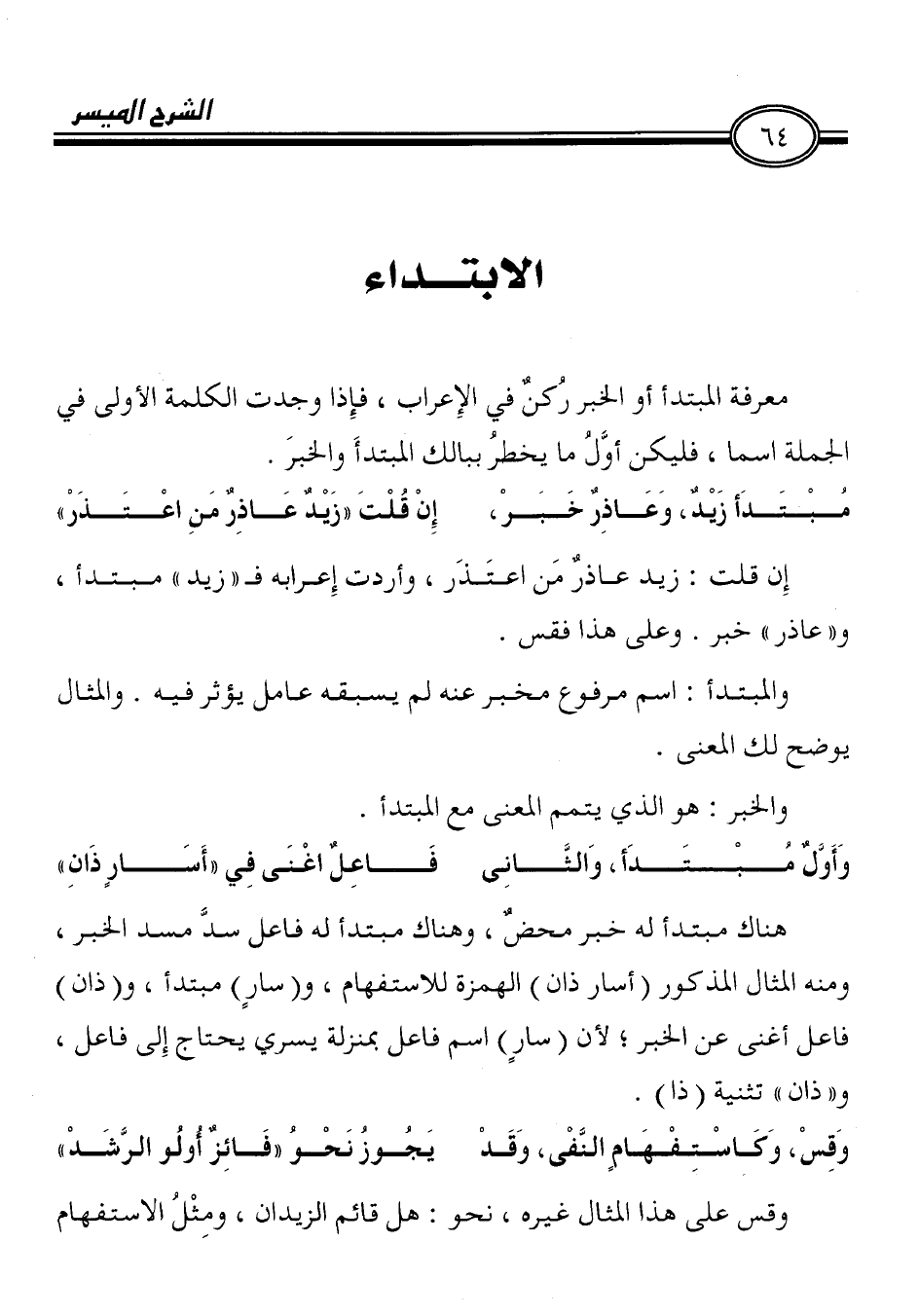 معرفة المبتدأ أو الخبر رُكنٌ في الإِعراب، فإِذا وجدت الكلمة الا! ولى في