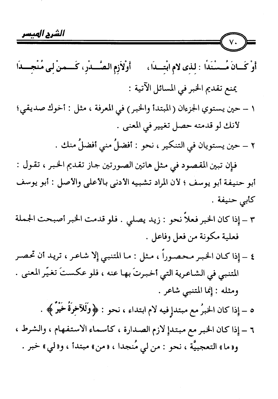 3 - إِذا كان الخبر فعلاً نحو: زيد يصلي. فلو قدمت الخبر أصبحت الجملة
