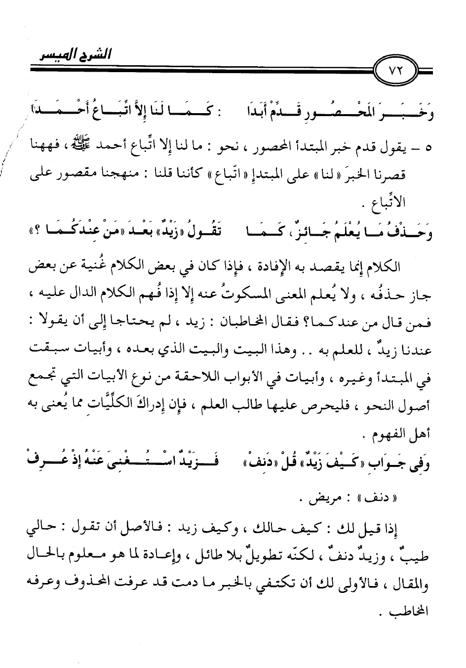 وَفِى جَوَابِ " كَيْفَ زَيْدٌ" قُلْ " دَنِفْ " فَزَيْدٌ اسْ! غْنِىَ عَنْهُ إِذْ عُرِفْ