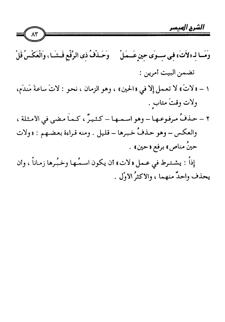وَمَا دِ" لاَتَ " فِى دسِوَى حِبنٍ عَمَلْ وَحَذْفُ ذِى الرَّفْعِ فَشَا، وَالْعَكْسُ قَلْ
