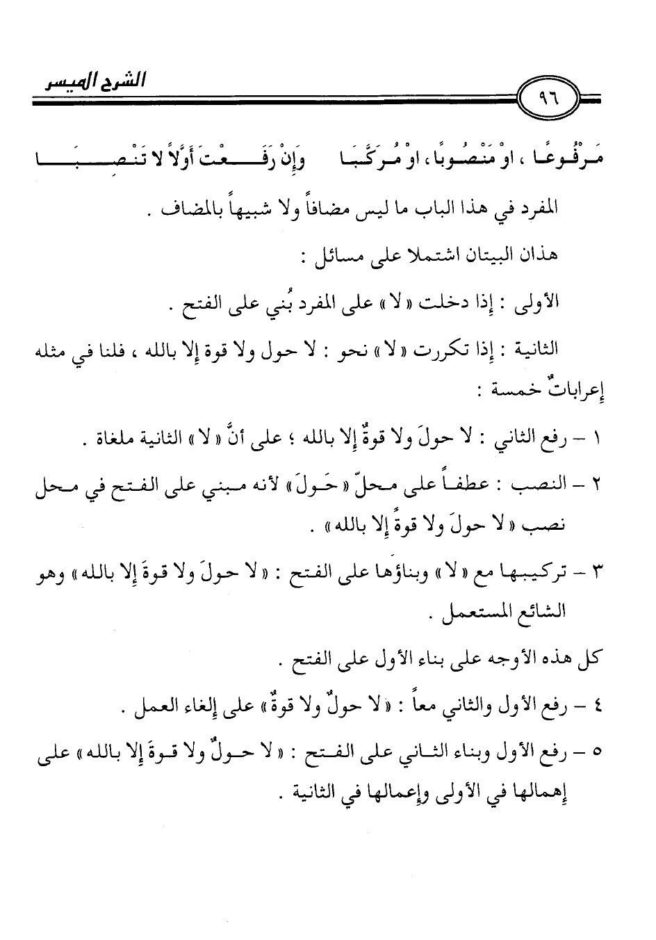 الثانية: إِذا تكررت " لا " نحو: لا حول ولا قوة إِلا بالله، فلنا في مثله