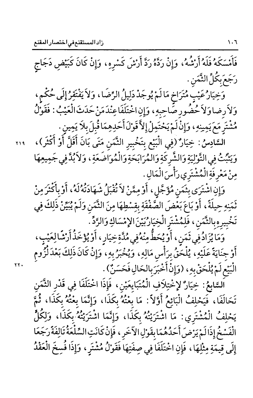 السادس: خيار "في البيع بتخيير الثمن متى بان أقل أو أكثر" ويثبت في التولية والشركة والمرابحة والمواضعة ولا بد في جميعها من معرفة المشتري رأس المال.