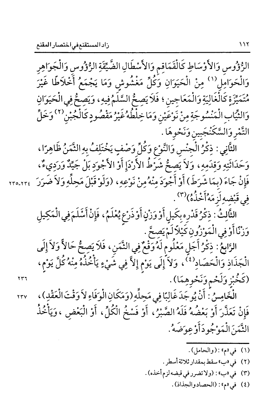الرؤوس والأوساط كالقماقم والأسطال الضيقة الرؤوس والجواهر والحوامل1 من الحيوان وكل مغشوش وما يجمع أخلاطا غير متميزة كالغالية والمعاجين فلا يصح السلم فيه ويصح في الحيوان والثياب المنسوجة من نوعين وما خلطه غير مقصود كالجبن2 وخل التمر والسكنجبين ونحوها.