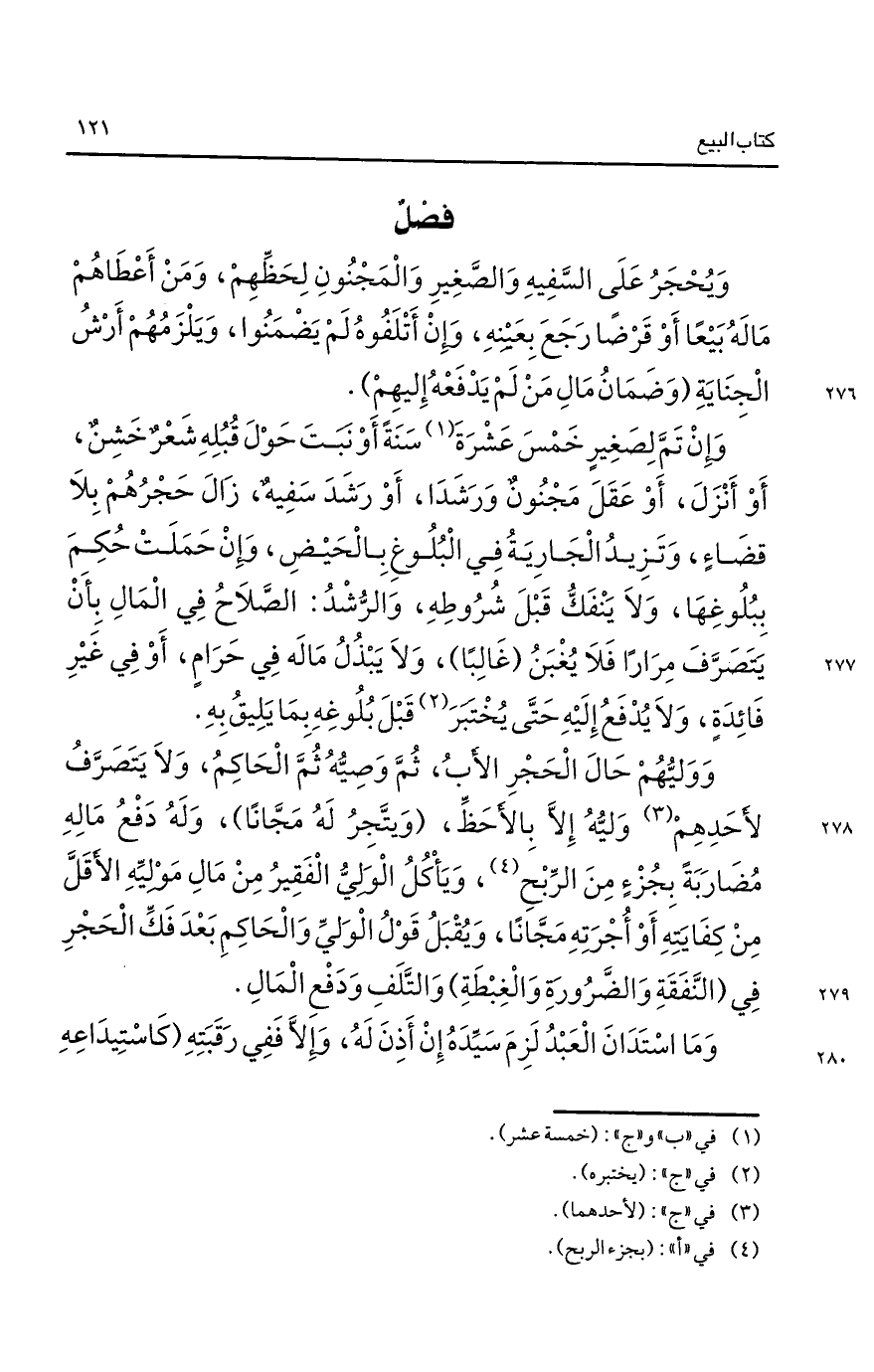 ووليهم حال الحجر: الأب ثم وصيه ثم الحاكم ولا يتصرف لأحدهم3 وليه إلا بالأحظ "ويتجر له مجانا" وله دفع ماله مضاربة بجزء من الربح4 ويأكل الولي الفقير من مال موليه الأقل من كفايته أو أجرته مجانا ويقبل قول الولي والحاكم بعد فك الحجر في "النفقة وفي وجود الضرورة والغبطة" والتلف ودفع المال.