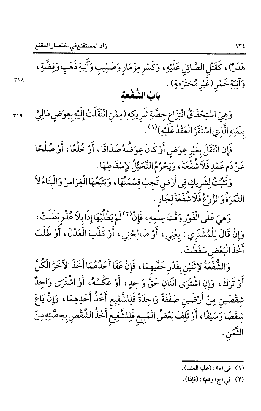 والشفعة لاثنين بقدر حقيهما فإن عفا أحدهما أخذ الأخر الكل أو ترك وإن اشترى اثنان حق واحد أو عكسه أو اشترى واحد شقصين من أرضين صفقة واحدة فللشفيع أخذ أحدهما وإن باع شقصا وسيفا أو تلف بعض المبيع فللشفيع أخذ الشقص بحصته من الثمن.