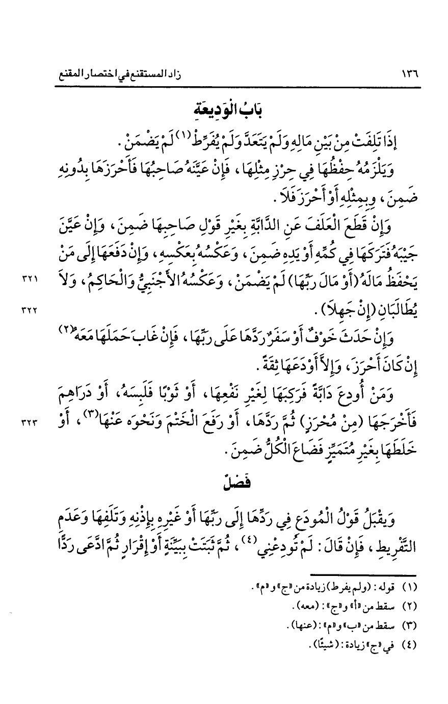 ويقبل قول المودع في ردها إلى ربها أو غيره بإذنه وفي تلفها وعدم التفريط فإن قال: لم تودعني4 ثم ثبتت ببينة أو إقرار ثم ادعى ردا