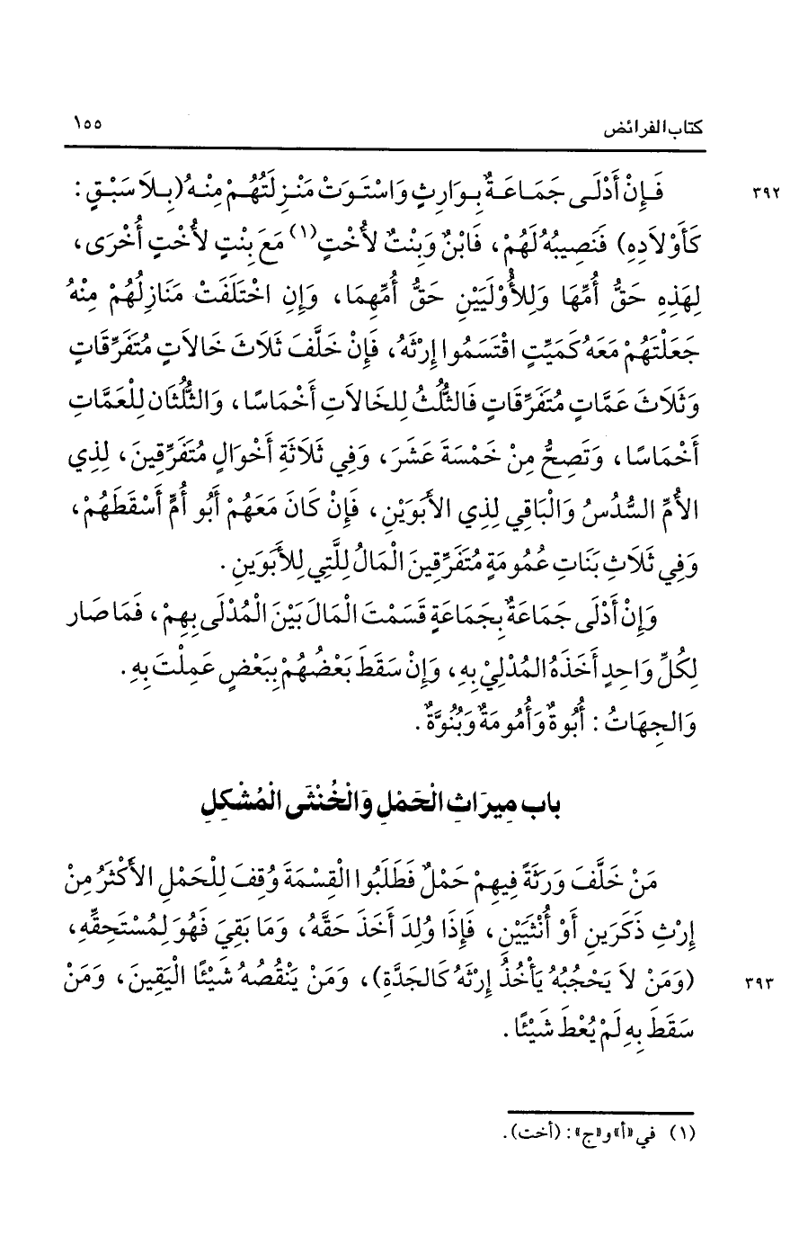 من خلف ورثة فيهم حمل فطلبوا القسمة وقف للحمل الأكثر من إرث ذكرين أو أنثيين فإذا ولد أخذ حقه وما بقي فهو لمستحقه "ومن لا يحجبه يأخذ إرثه كالجدة" ومن ينقصه شيئا اليقين ومن يسقط به لم يعط شيئا.