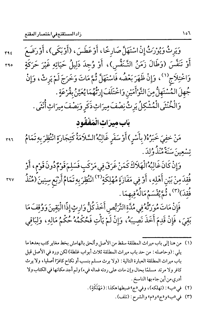 1من هنا إلى باب ميراث المطلقة سقط من الأصل وألحق بالهامش بخط مغاير كتب بعدها ما يلي: وحاصله: من حد باب ميراث المطلقة ثلاث أبواب غلطة لكن ورد في الأصل قبل باب ميراث المطلقة العبارة التالية: ولا يرث مسلم بنسب أو نكاح كافرا أصليا، ولا يرث كافر ولا مرتد مسلما بحال وإن مات على ردته فماله فيء ولم أجد مكانها في الكتاب ولا أدري من أين جاء بها الناسخ.