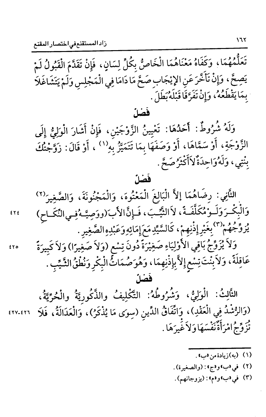 وله شروط أحدها: تعيين الزوجين فإن أشار الولي إلى الزوجة أو سماها أو وصفها بما تتميز به1 أو قال: زوجتك بنتي وله واحدة لا أكثر صح.