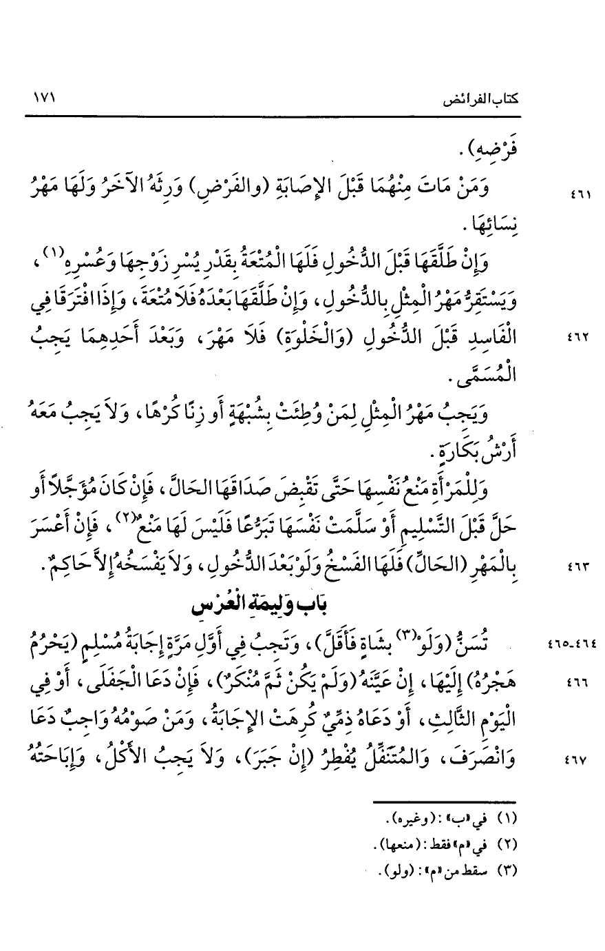 تسن "ولو1 بشاة فأقل" وتجب في أول مرة إجابة مسلم "يحرم هجره" إليها إن عينه "ولم يكن ثم منكر" فإن دعا الجفلى أو في اليوم الثالث أو دعاه ذمي كرهت الإجابة ومن صومه واجب دعا وانصرف والمتنفل يفطر "إن جبر" ولا يجب الأكل وإباحته