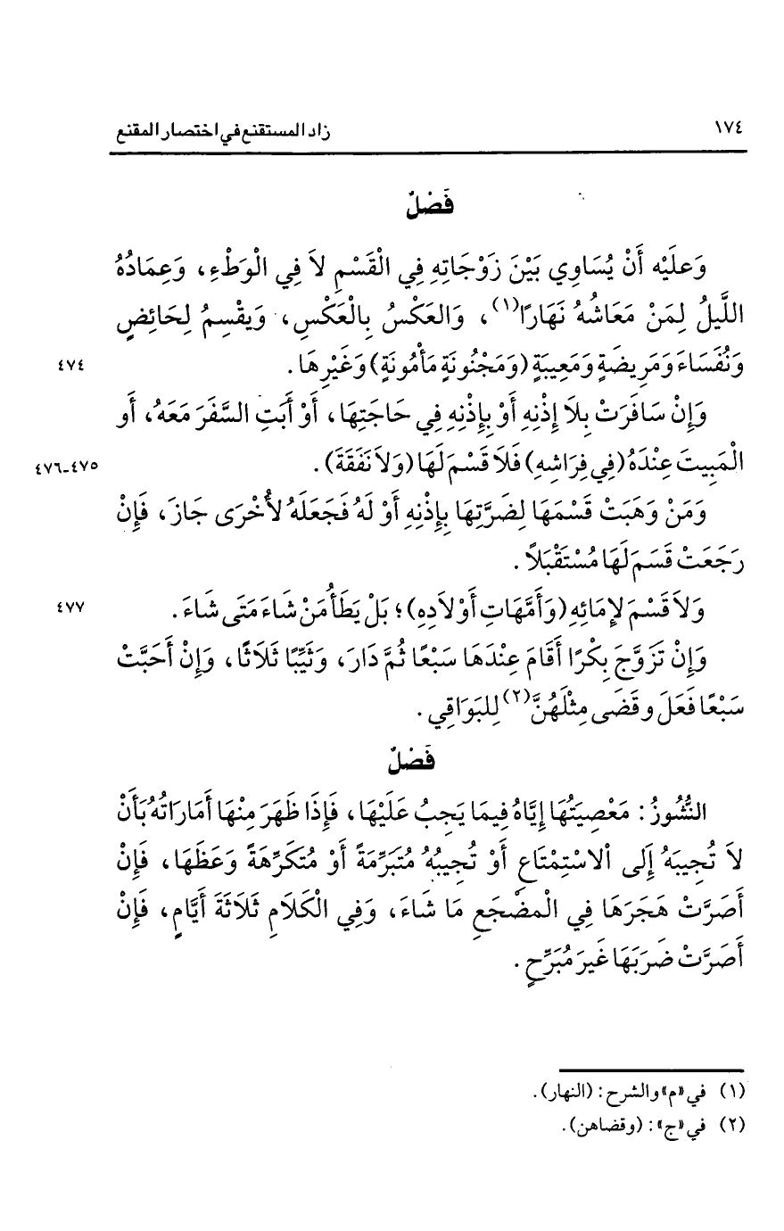وعليه أن يساوى يين زوجاته في القسم وعماده الليل لمن معاشه النهار1 والعكس بالعكس ويقسم لحائض ونفساء ومريضة ومعيبة "ومجنونة مأمونة" وغيرها.