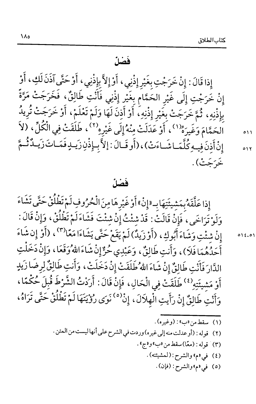إذا قال: إن خرجت بغير إذني أو إلا بإذني أو حتى آذن لك أو إن خرجت إلى غير الحمام بغير إذني فأنت طالق فخرجت مرة بإذنه ثم خرجت بغير إذنه أو أذن لها ولم تعلم بالإذن أو خرجت تريد الحمام وغيره1 أو عدلت منه إلى غيره2 طلقت في الكل "لا إن أذن فيه كلما شاءت", "أو قال: إلا بإذن زيد فمات زيد ثم خرجت".
