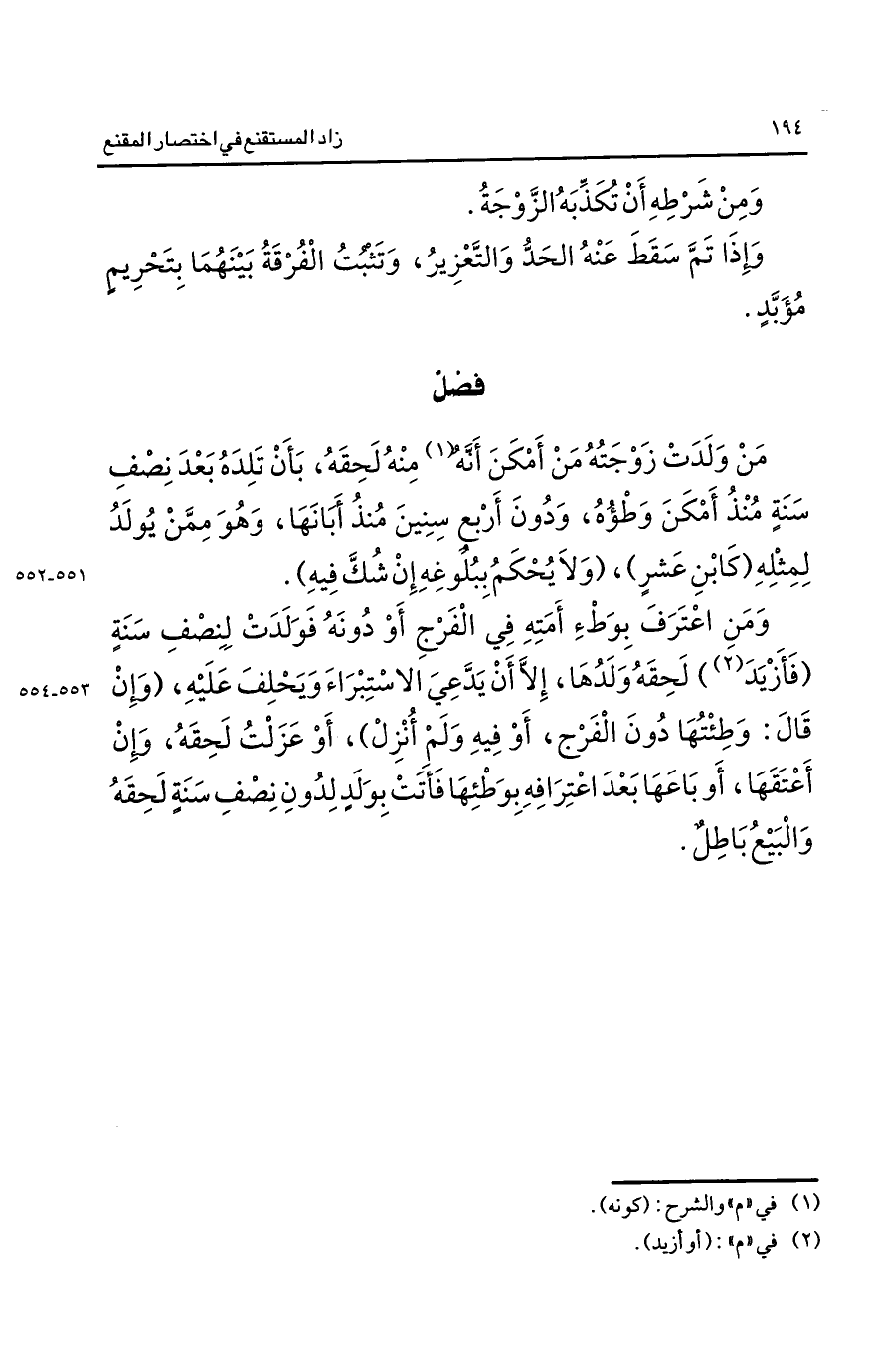 من ولدت زوجته منه أمكن أنه1 منه لحقه بأن تلده بعد نصف سنة منذ أمكن وطؤه أو دون أربع سنين منذ أبانها وهو ممن يولد لمثله "كابن عشر", "ولا يحكم ببلوغه إن شك فيه".